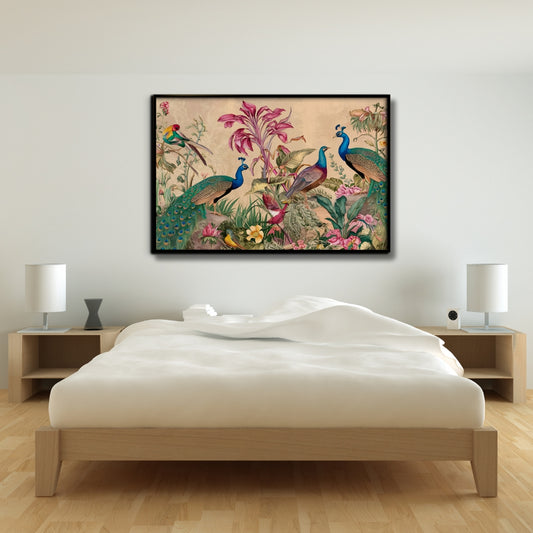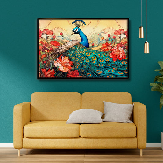 Regal Bloom Peacock Canvas Painting Framed Wall Art