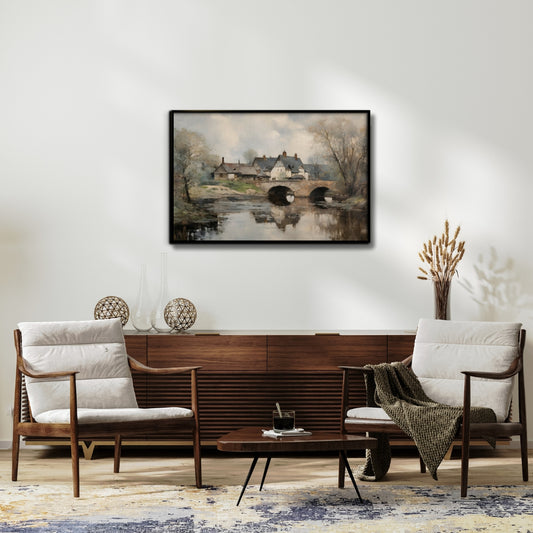 Rustic Reflections Countryside Bridge Over A Peaceful River Canvas Painting Framed Wall Art
