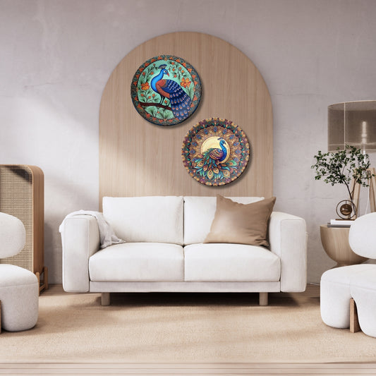 Set of 2 Sacred Peacock Blessings Ceramic Wall Plates Home Décor