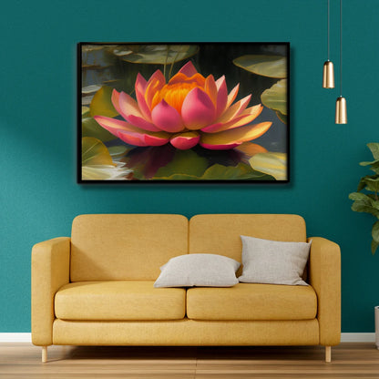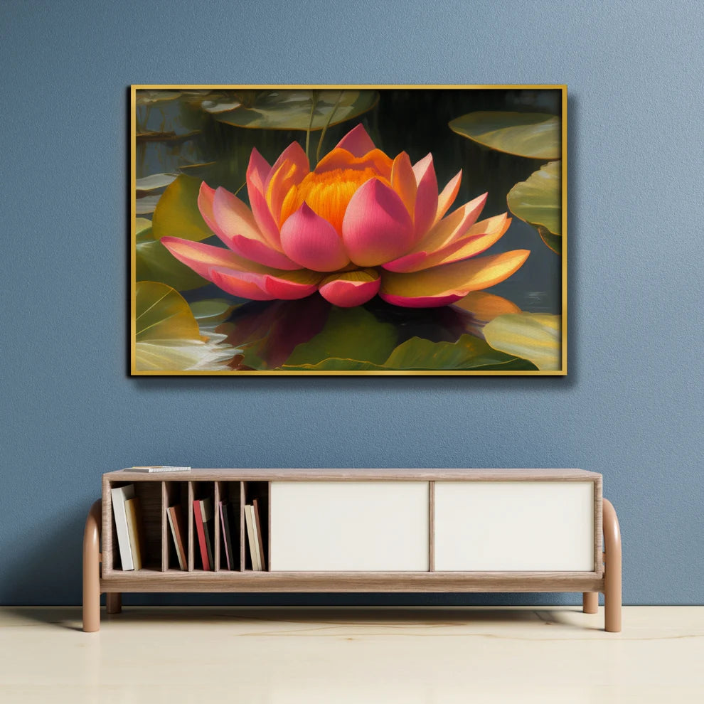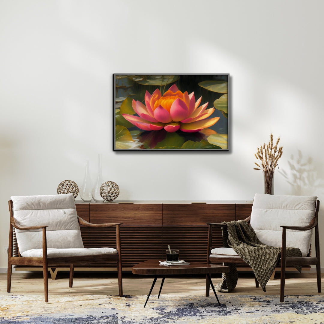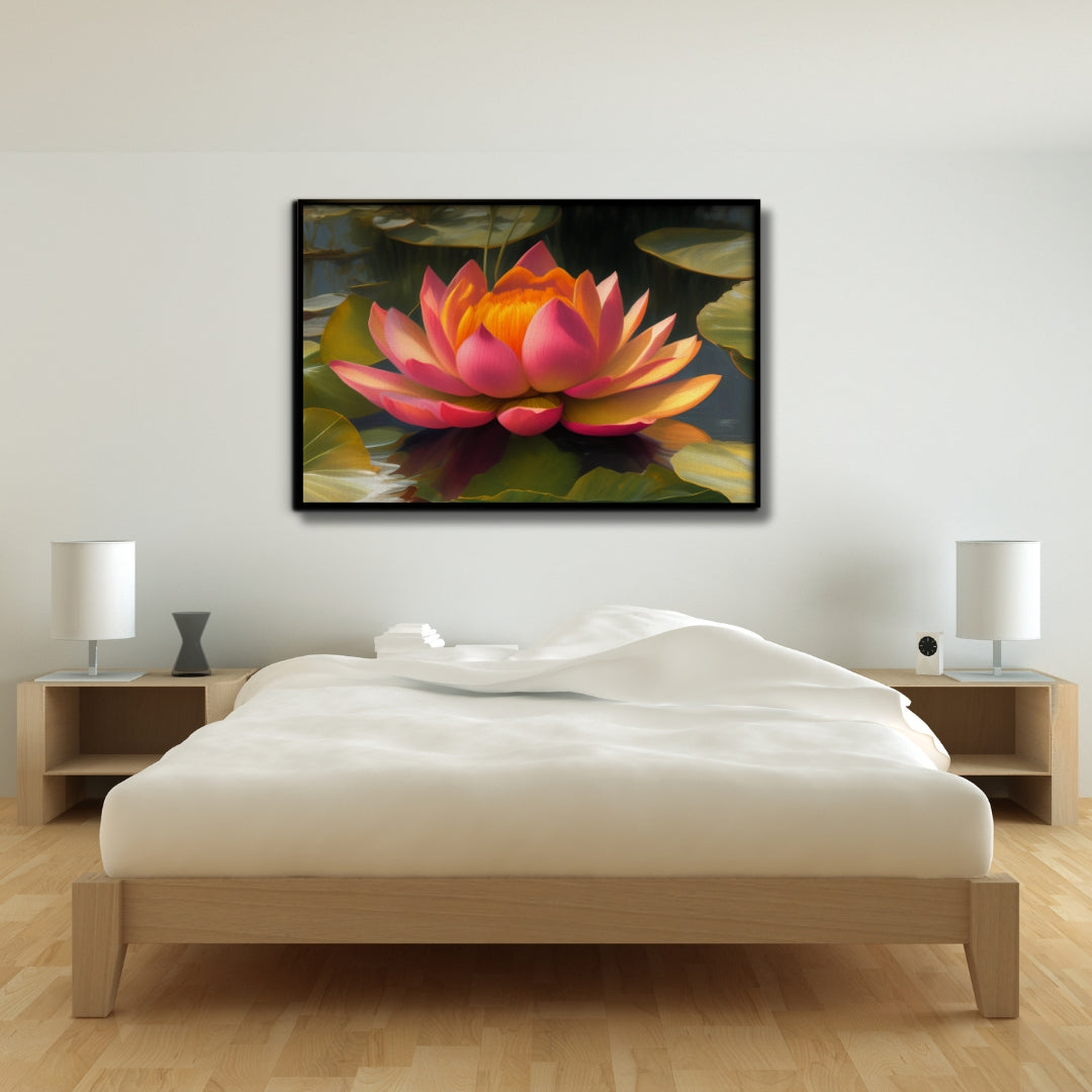 Immerse your space in tranquility with Lotus Serenity, a breathtaking framed Canvas Print wall art featuring a radiant pink and orange lotus blooming gracefully over serene waters. Symbolizing purity, enlightenment, and peace, this artwork brings a touch of nature’s elegance to any room. The rich details and lifelike colors create a calming ambiance, making it a perfect addition to your living room, bedroom, or meditation space. Elevate your decor with this timeless masterpiece that exudes harmony and grace.