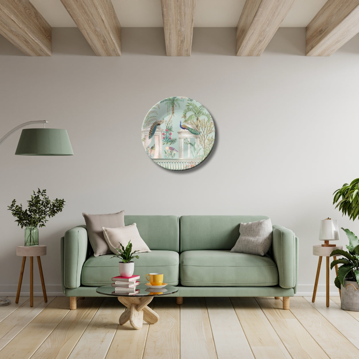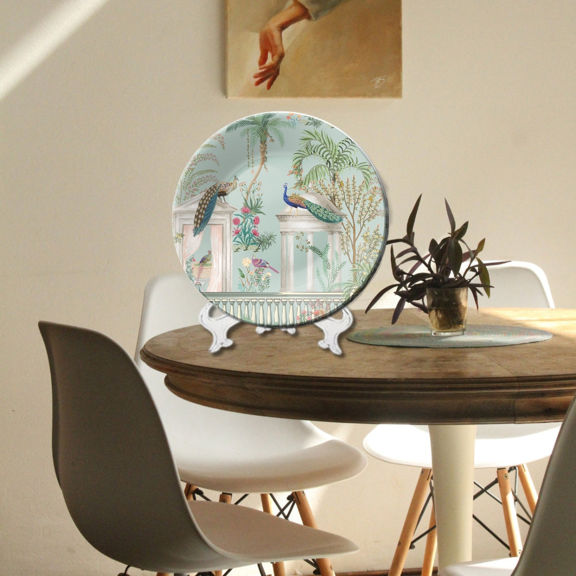 Bring home the charm of royal courtyards with the Majestic Courtyard Birds Peacock Decorative Wall Plate, a breathtaking artwork that blends elegance, nature, and heritage design. Featuring beautifully detailed peacocks perched gracefully on classical pillars, surrounded by lush foliage and vibrant florals, this wall plate captures the serene beauty of a regal garden. The pastel backdrop and intricate hand-drawn elements give it a timeless, luxurious appeal.