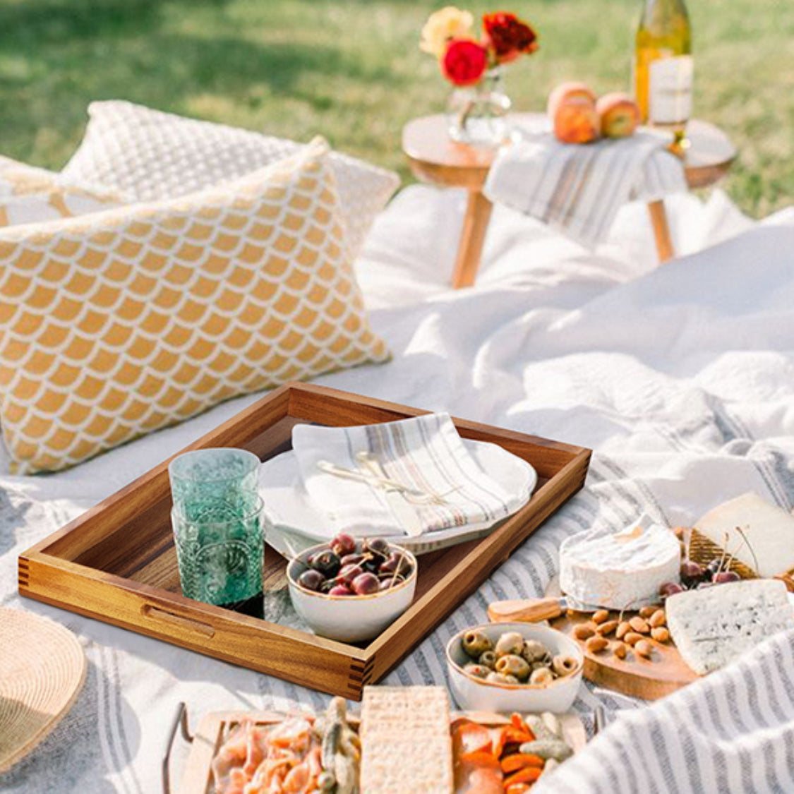 Perfectly sized for ottomans, coffee tables, and couches, it provides a stable surface for serving drinks, snacks, or breakfast in bed. The sturdy built-in handles ensure easy carrying from room to room, making it ideal for parties, gatherings, and relaxed patio mornings.
